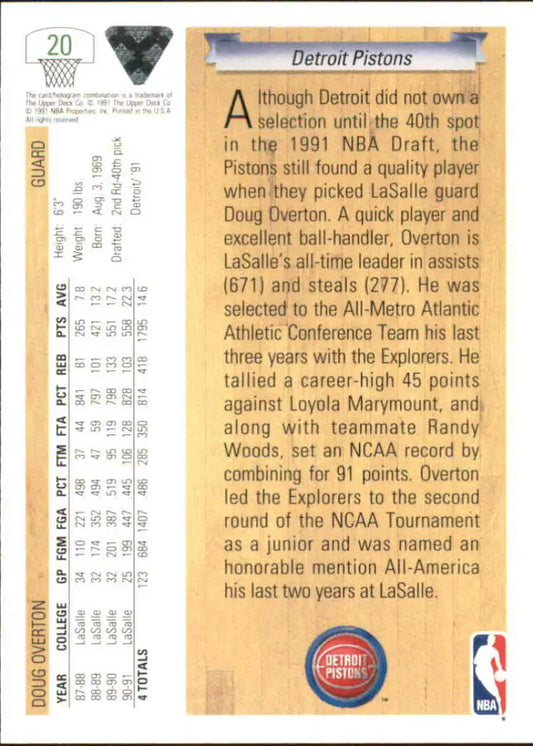 1991-92 Upper Deck #20 Doug Overton NM-MT RC Rookie Detroit Pistons Basketball Card