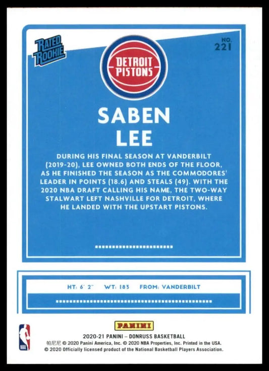 2020-21 Panini Donruss Saben Lee #221 Rookie Detroit Pistons Basketball Card NBA