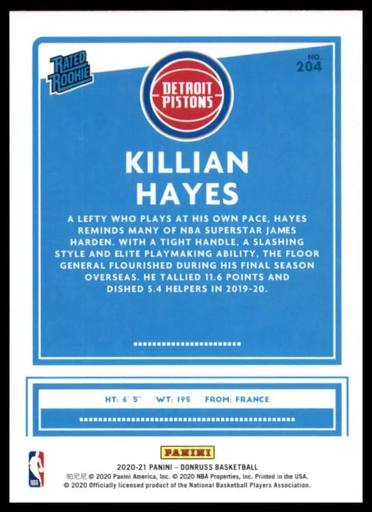 2020-21 Panini Donruss Rookie Killian Hayes #204 Detroit Pistons Basketball Card