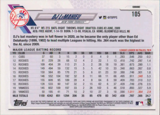 2021 Topps Chrome #105 DJ LeMahieu NM-MT New York Yankees Baseball Card