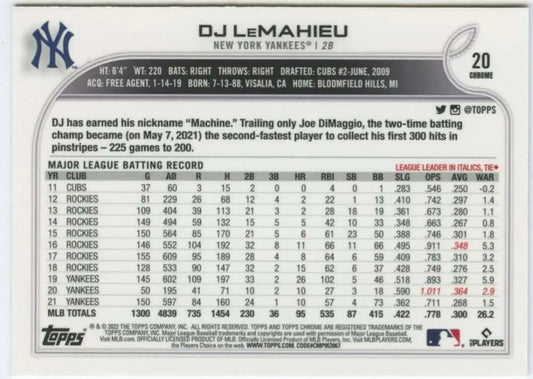 2022 Topps Chrome #20 DJ LeMahieu NM-MT New York Yankees Baseball Card
