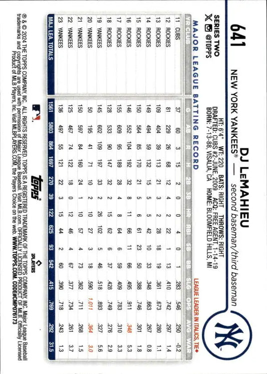 2024 Topps #641 DJ LeMahieu NM-MT New York Yankees Baseball Card
