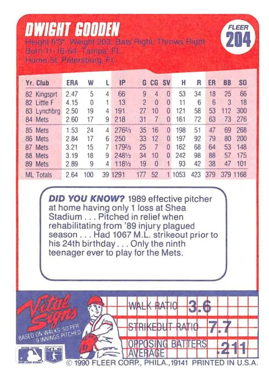 1990 Fleer #204 Dwight Gooden NM-MT New York Mets Baseball Card