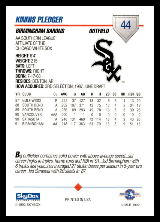 1992 Skybox AA #44 Kinnis Pledger Birmingham Barons NM-MT Baseball Card