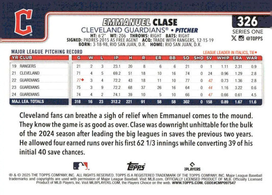 2025 Topps #326 Emmanuel Clase NM-MT Cleveland Guardians Baseball Card