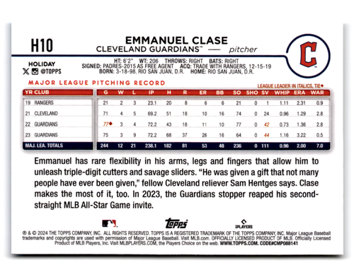 2024 Topps Holiday #H10 Emmanuel Clase NM-MT Guardians ID:74785