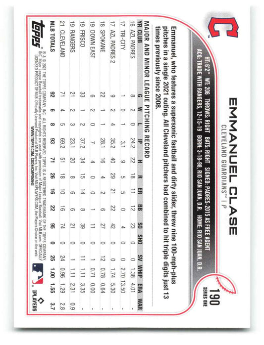 2022 Topps #190 Emmanuel Clase NM-MT Guardians ID:41002