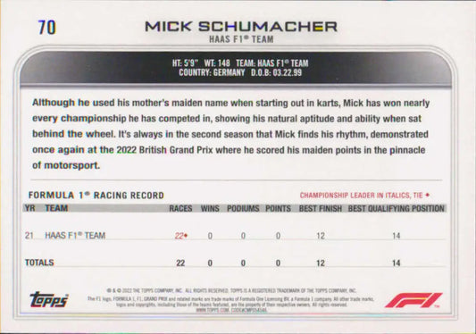 2022 Topps Formula 1 #70 Mick Schumacher NM-MT Racing Card