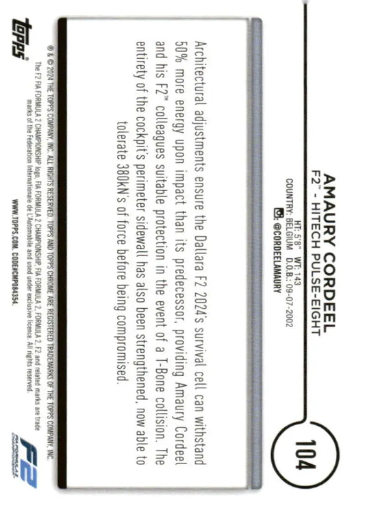 2024 Topps Chrome Formula 1 #104 Amaury Cordeel NM-MT F2 - Hitech Pulse-Eight Racing Card
