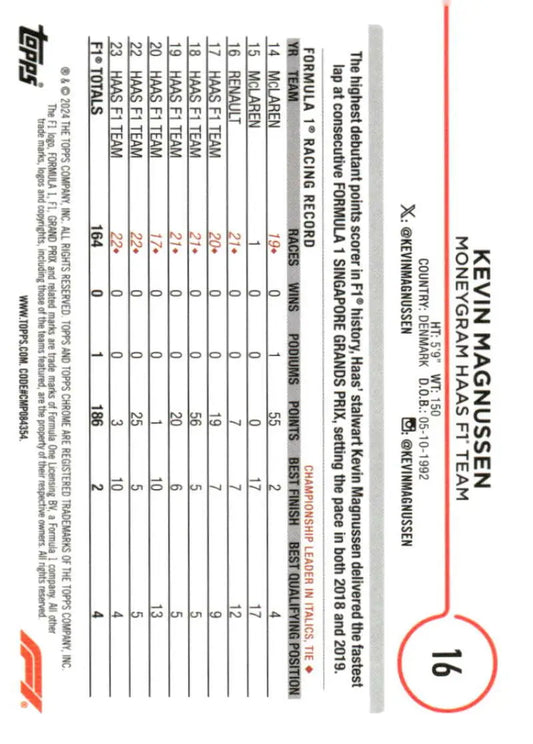 2024 Topps Chrome Formula 1 #16 Kevin Magnussen NM-MT MoneyGram Haas F1 Team Racing Card