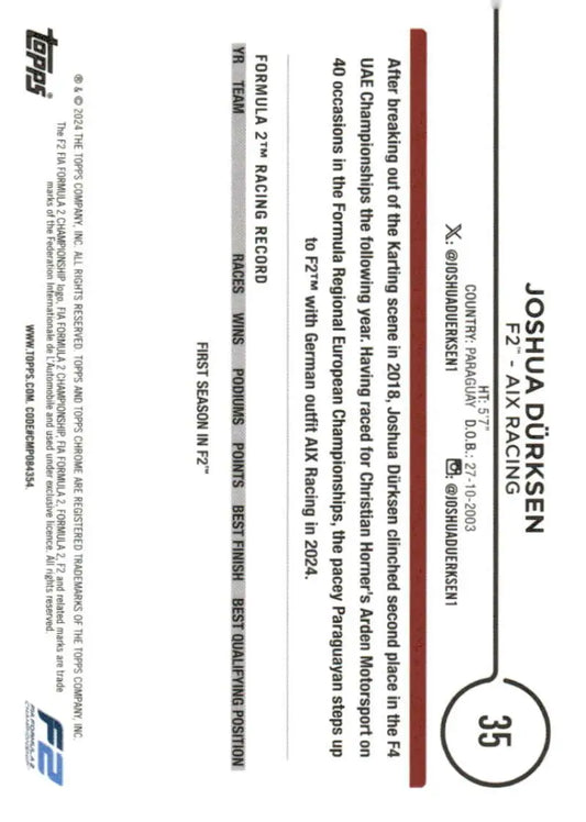 2024 Topps Chrome Formula 1 #35 Joshua Durksen NM-MT F2 - AIX Racing Racing Card