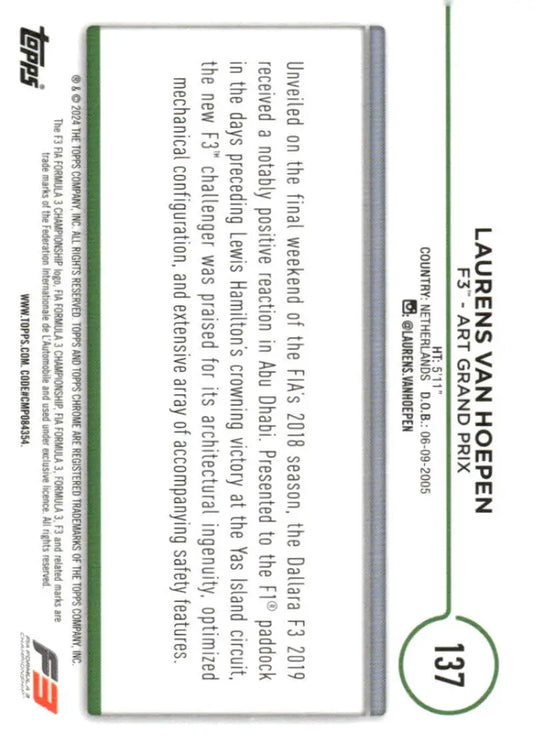 2024 Topps Chrome Formula 1 #137 Laurens van Hoepen NM-MT F3 - ART Grand Prix Racing Card