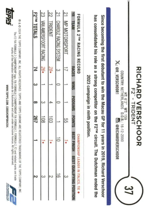 2024 Topps Chrome Formula 1 #37 Richard Verschoor NM-MT F2 - Trident Racing Card