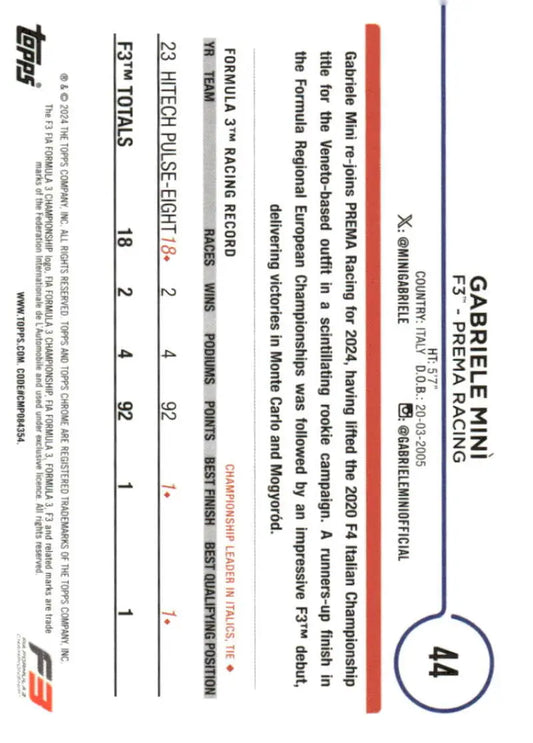 2024 Topps Chrome Formula 1 #44 Gabriele Mini NM-MT F3 - PREMA Racing Racing Card