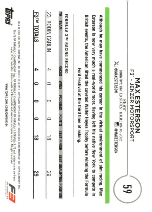 2024 Topps Chrome Formula 1 #59 Max Esterson NM-MT F3 - Jenzer Motorsport Racing Card