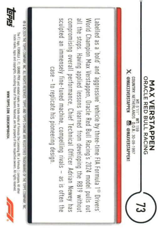 2024 Topps Chrome Formula 1 #73 Max Verstappen NM-MT Oracle Red Bull Racing Racing Card