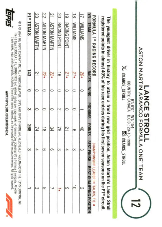 2024 Topps Chrome Formula 1 #12 Lance Stroll NM-MT Aston Martin Aramco Formula One Team Racing Card