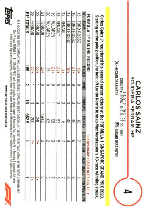 2024 Topps Chrome Formula 1 #4 Carlos Sainz NM-MT Scuderia Ferrari HP Racing Card
