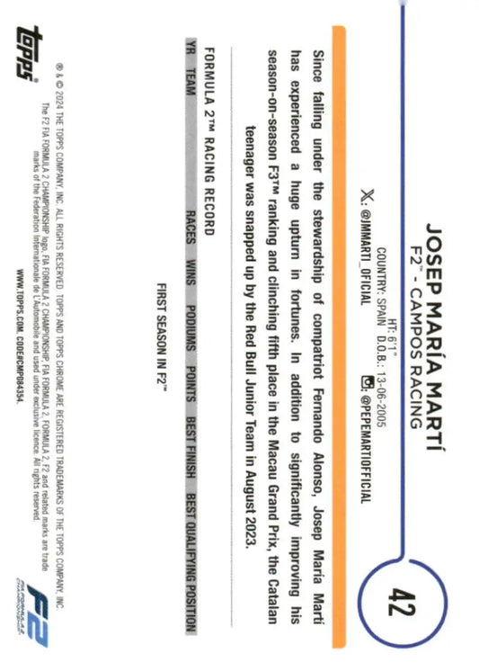 2024 Topps Chrome Formula 1 #42 Josep Maria Marti NM-MT F2 - Campos Racing Racing Card