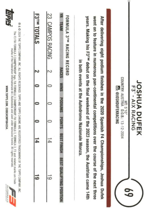 2024 Topps Chrome Formula 1 #69 Joshua Dufek NM-MT F3 - AIX Racing Racing Card