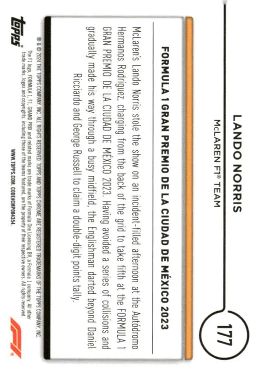 2024 Topps Chrome Formula 1 #177 Lando Norris NM-MT McLaren F1 Team Racing Card