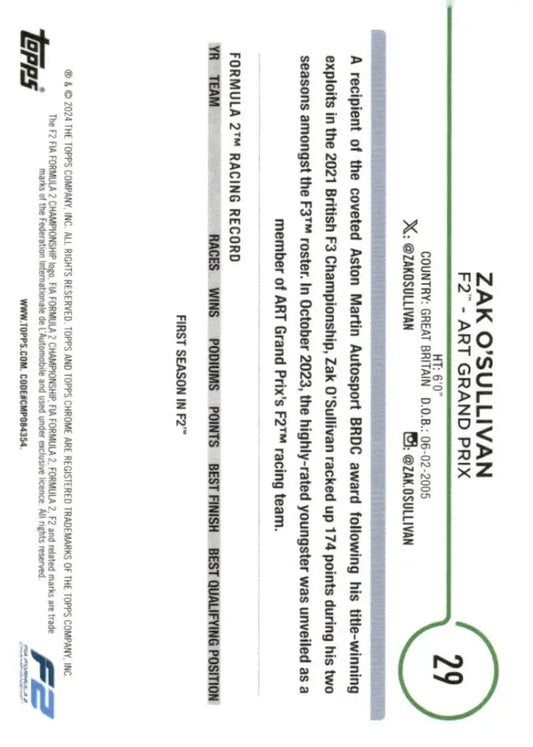 2024 Topps Chrome Formula 1 #29 Zak O'Sullivan NM-MT F2 - ART Grand Prix Racing Card