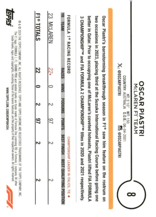2024 Topps Chrome Formula 1 #8 Oscar Piastri NM-MT McLaren F1 Team Racing Card