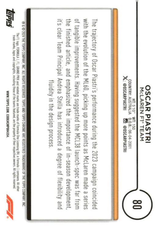 2024 Topps Chrome Formula 1 #80 Oscar Piastri NM-MT McLaren F1 Team Racing Card