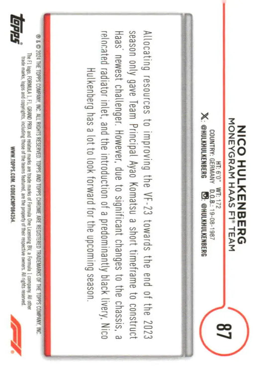 2024 Topps Chrome Formula 1 #87 Nico Hulkenberg NM-MT MoneyGram Haas F1 Team Racing Card