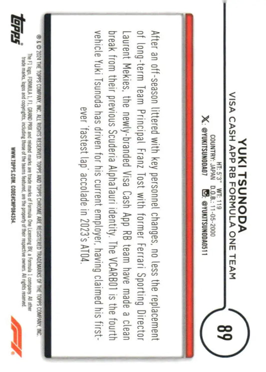 2024 Topps Chrome Formula 1 #89 Yuki Tsunoda NM-MT Visa Cash App RB Formula One Team Racing Card