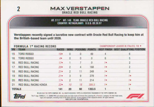 2022 Topps Formula 1 #2 Max Verstappen NM-MT Racing Card