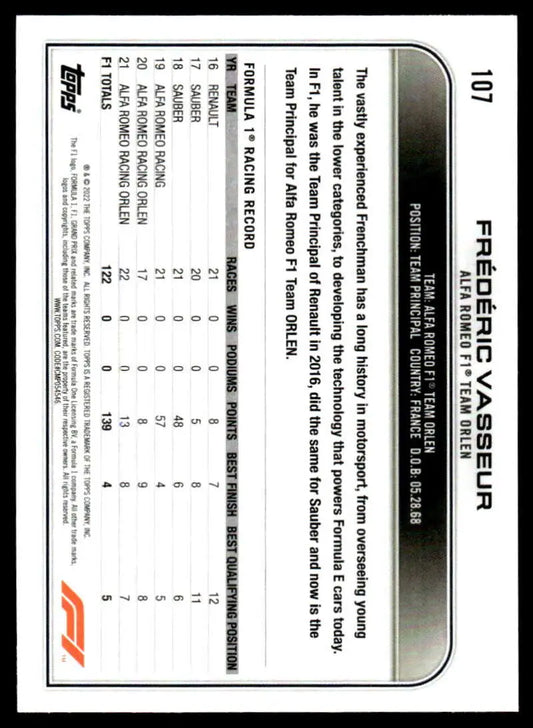 2022 Topps Formula 1 Checker Flag #107 Frederic Vasseur NM-MT Racing Card