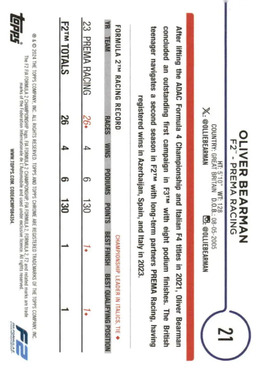 2024 Topps Chrome Formula 1 #21 Oliver Bearman NM-MT F2 - PREMA Racing Racing Card