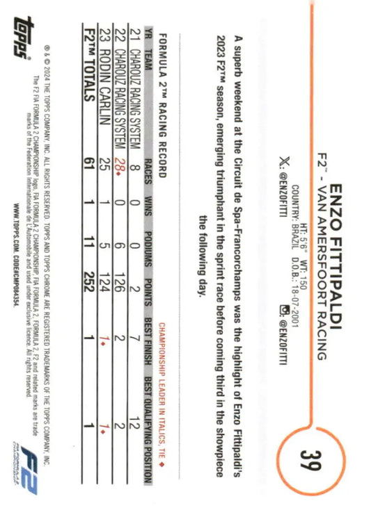 2024 Topps Chrome Formula 1 #39 Enzo Fittipaldi NM-MT F2 - Van Amersfoort Racing Racing Card