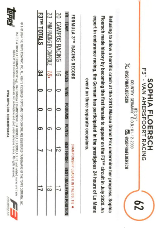 2024 Topps Chrome Formula 1 #62 Sophia Floersch NM-MT F3 - Van Amersfoort Racing Racing Card