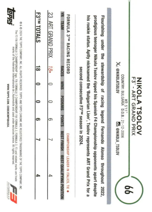 2024 Topps Chrome Formula 1 #66 Nikola Tsolov NM-MT F3 - ART Grand Prix Racing Card