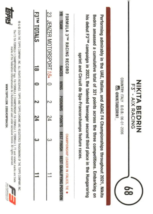 2024 Topps Chrome Formula 1 #68 Nikita Bedrin NM-MT F3 - AIX Racing Racing Card