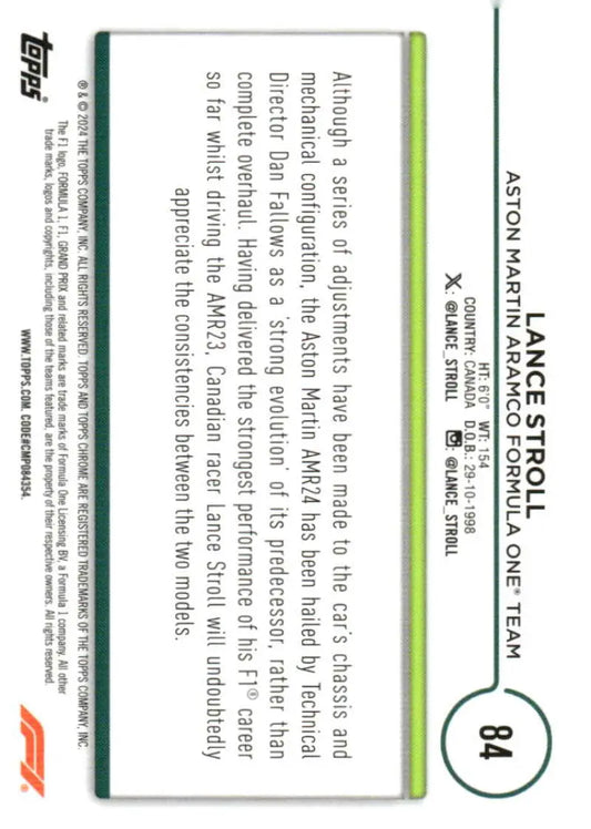 2024 Topps Chrome Formula 1 #84 Lance Stroll NM-MT Aston Martin Aramco Formula One Team Racing Card