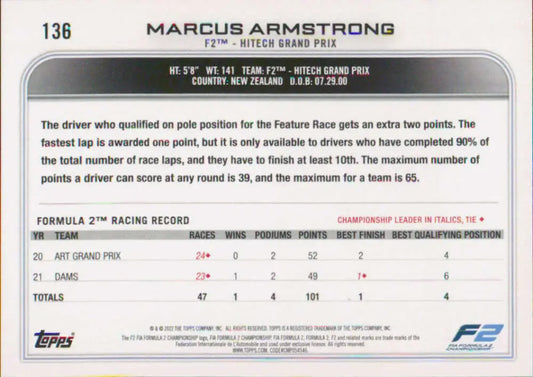 2022 Topps Formula 1 #136 Marcus Armstrong NM-MT Racing Card