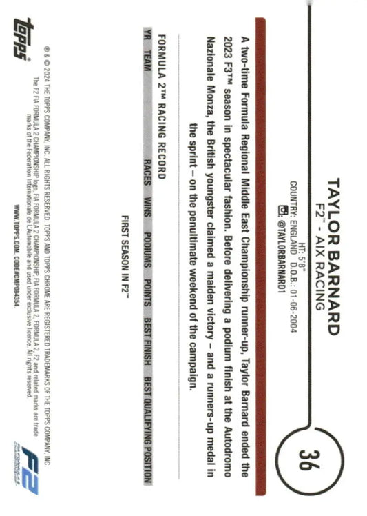2024 Topps Chrome Formula 1 #36 Taylor Barnard NM-MT F2 - AIX Racing Racing Card