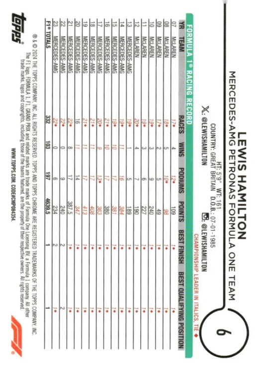 2024 Topps Chrome Formula 1 #6 Lewis Hamilton NM-MT Mercedes-AMG Petronas Formula One Team Racing Card