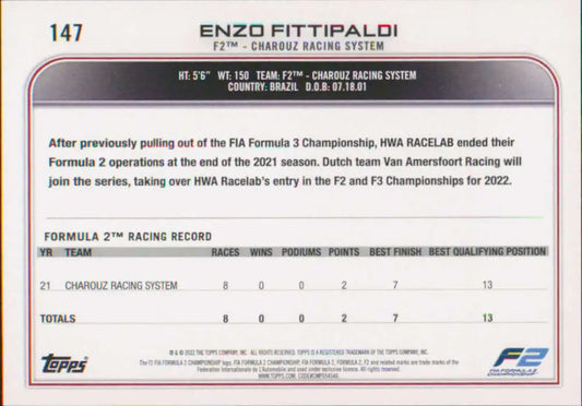 2022 Topps Formula 1 #147 Enzo Fittipaldi NM-MT Racing Card
