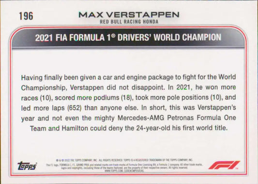 2022 Topps Formula 1 #196 Max Verstappen NM-MT Racing Card