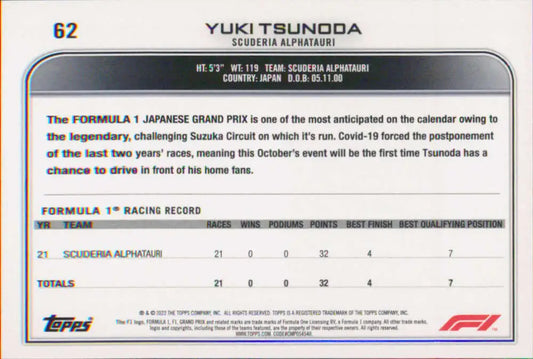 2022 Topps Formula 1 #62 Yuki Tsunoda NM-MT Racing Card