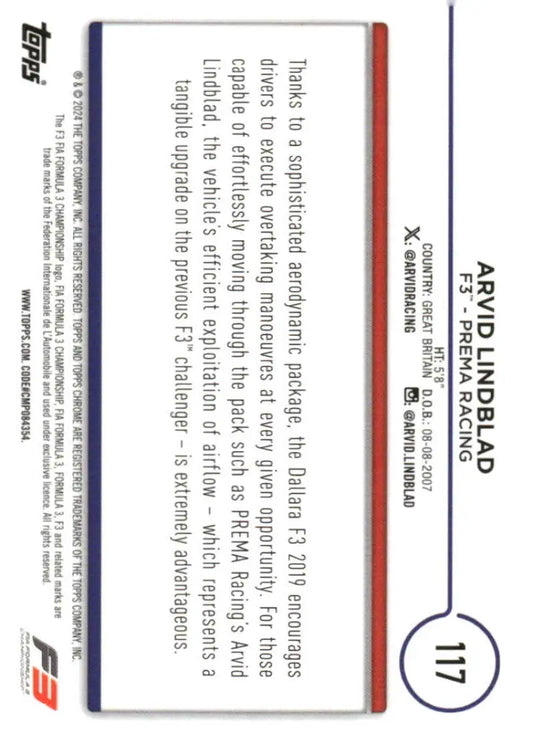 2024 Topps Chrome Formula 1 #117 Arvid Lindblad NM-MT F3 - PREMA Racing Racing Card