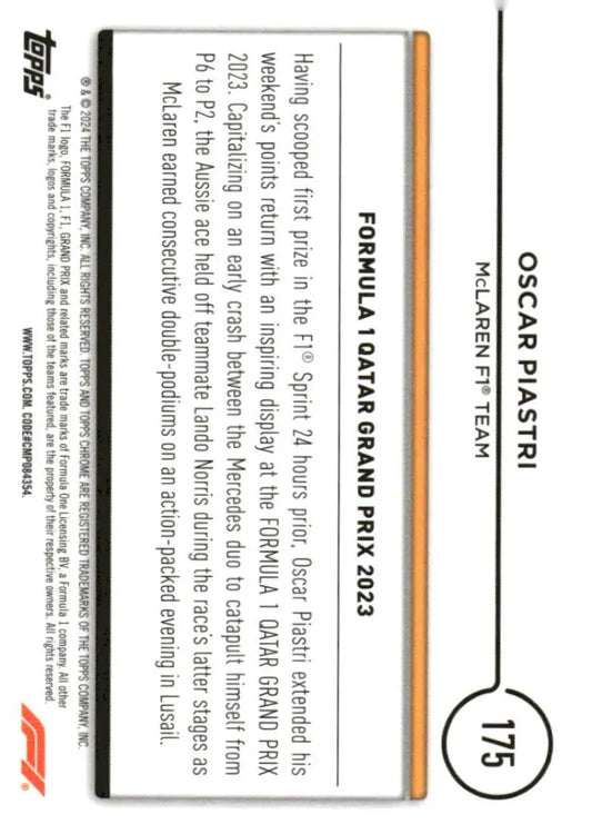 2024 Topps Chrome Formula 1 #175 Oscar Piastri NM-MT McLaren F1 Team Racing Card