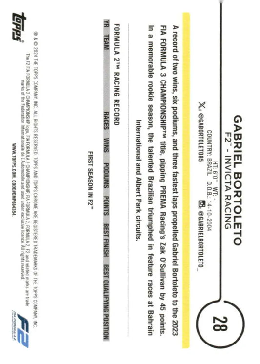 2024 Topps Chrome Formula 1 #28 Gabriel Bortoleto NM-MT F2 - Invicta Racing Racing Card