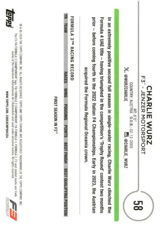 2024 Topps Chrome Formula 1 #58 Charlie Wurz NM-MT F3 - Jenzer Motorsport Racing Card