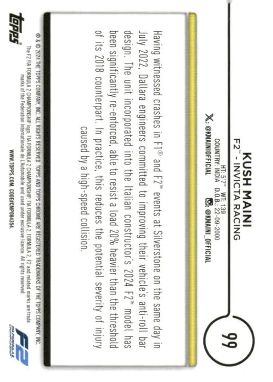 2024 Topps Chrome Formula 1 #99 Kush Maini NM-MT F2 - Invicta Racing Racing Card