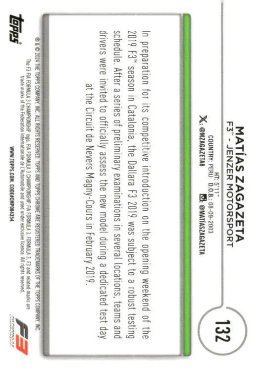 2024 Topps Chrome Formula 1 #132 Matias Zagazeta NM-MT F3 - Jenzer Motorsport Racing Card